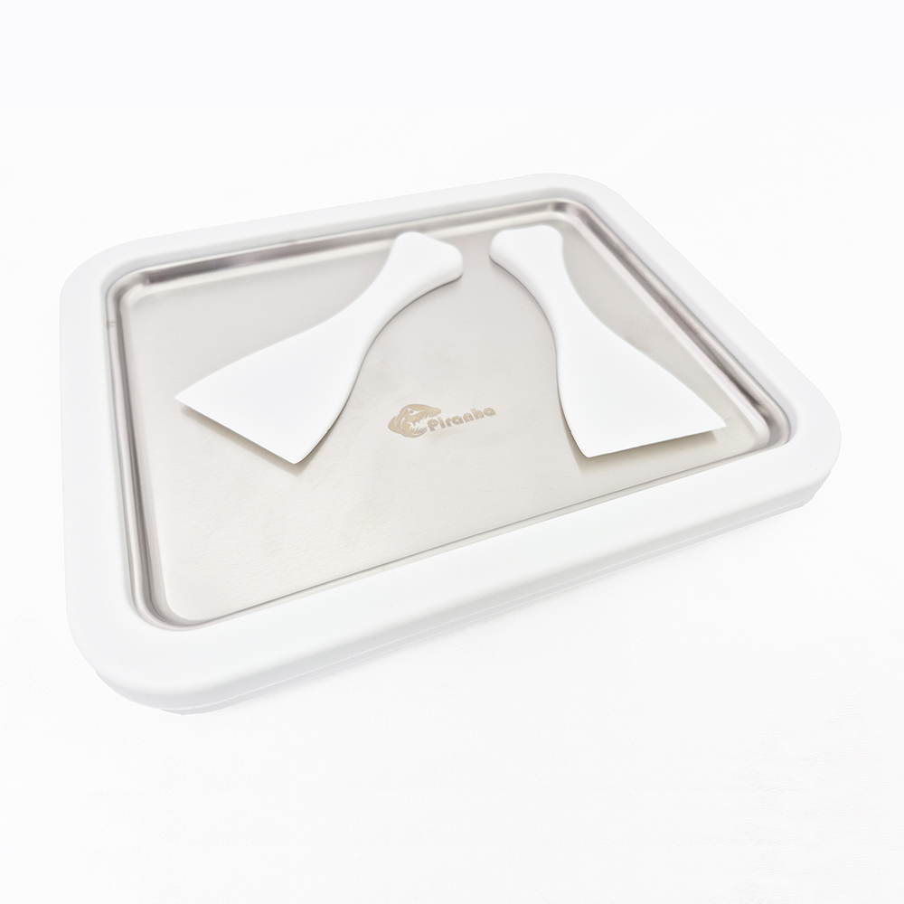 Simply freeze Your Piranha roll ice cream maker pan in the freezer for 10 hours, take it out and pour mixed ingredients on to the pan, wait until the ice cream is formed then use the spatulas to mix it together and/or crush your ingredients. When mixed and a frozen layer forms, use the spatula to scrape in one direction to create your ice cream rolls.